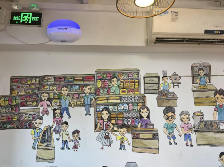 癸汶是餐厅目前雇佣的三位心智障碍员工之一,他还运用画笔参与了餐厅的布置,完成了餐厅墙面的壁画,细致描画了心智障碍青年的日常工作与生活,“那里话的是超市理货员,这里画的是志愿者陪老人散步、弹琴……”,癸汶的绘画天赋在这里得到施展,从后厨员工转身为楼面服务员,对于岗位的转变他直言“有点累,但我喜欢”。